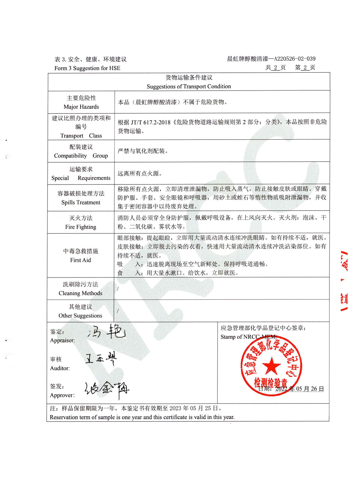 晨虹醇酸清漆道路貨物運輸鑒定書